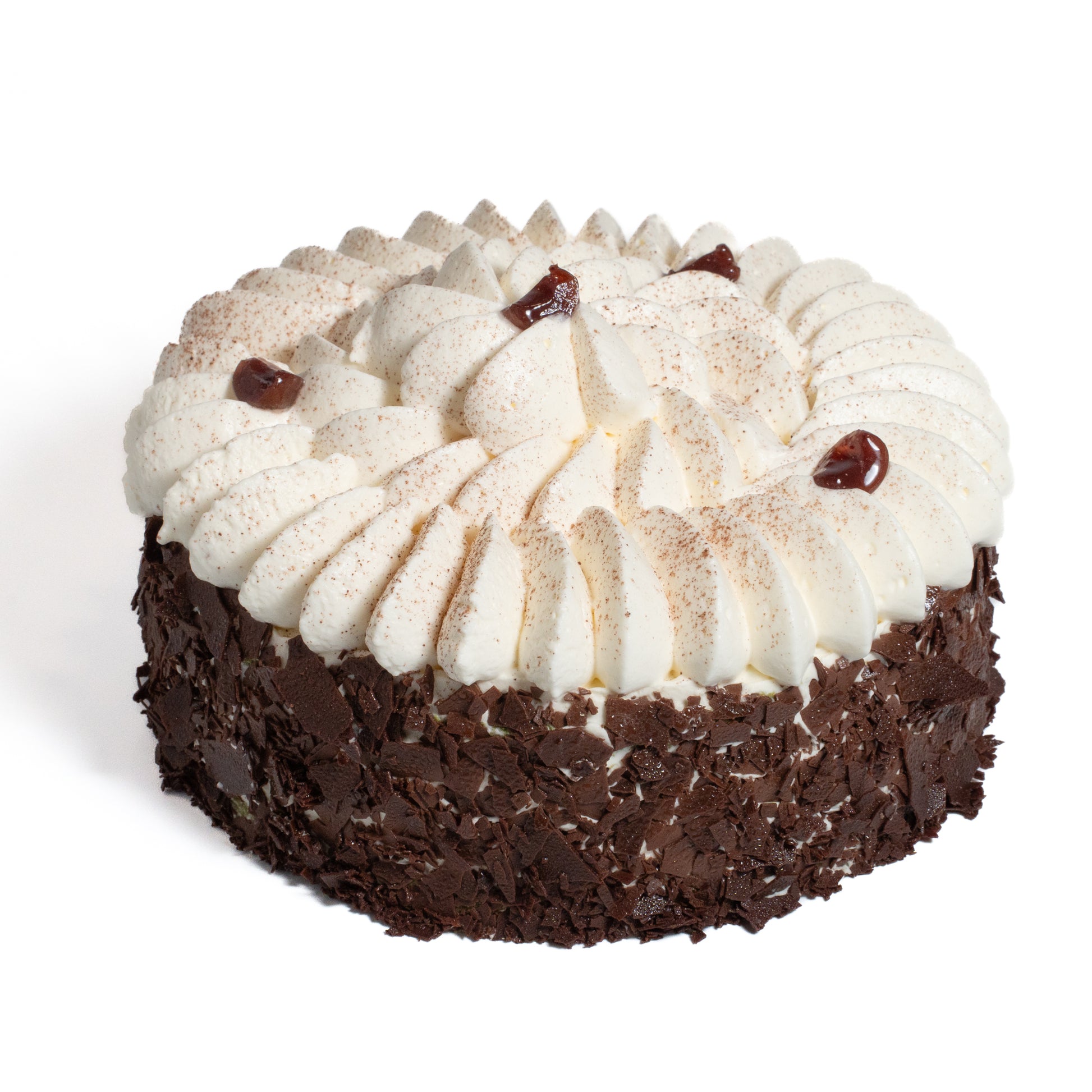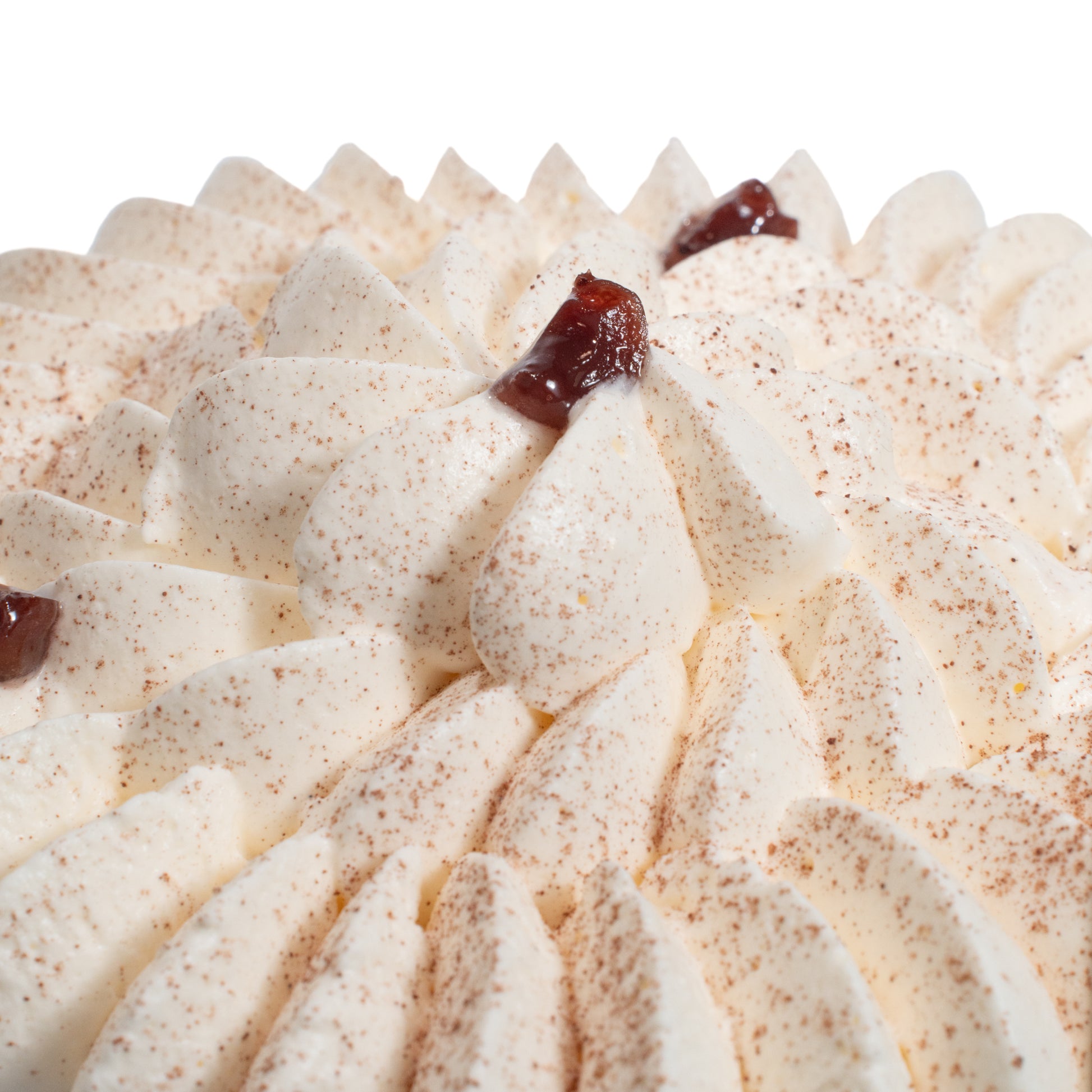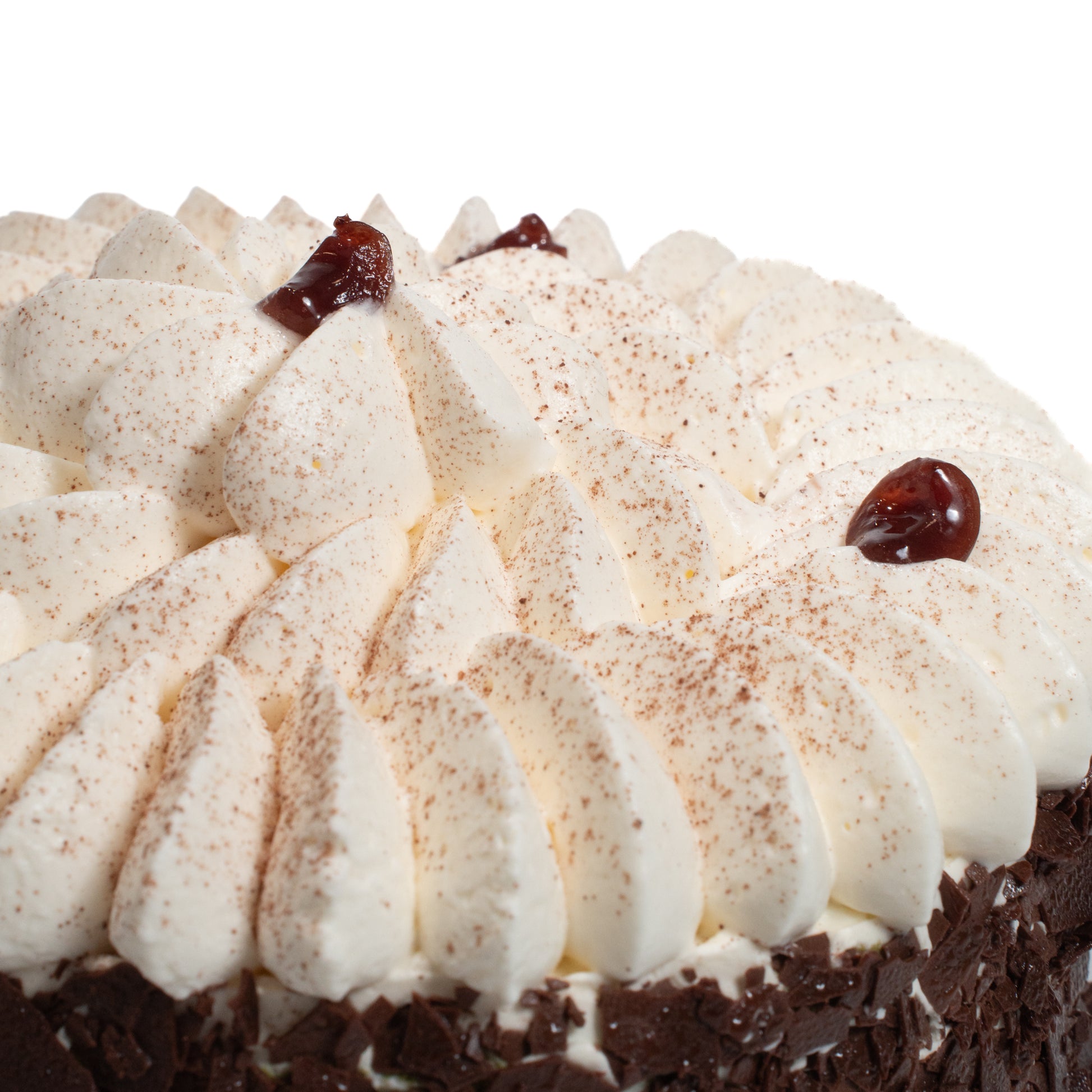 Forêt Noire is a refined dessert featuring delicate chocolate chiffon layers paired with smooth vanilla mascarpone cream. Enhanced by a touch of kirsch-soaked cherries, this cake balances rich cocoa flavours with subtle fruitiness, delivering an elegant and sophisticated taste experience. Perfect for those who appreciate classic patisserie craftsmanship.