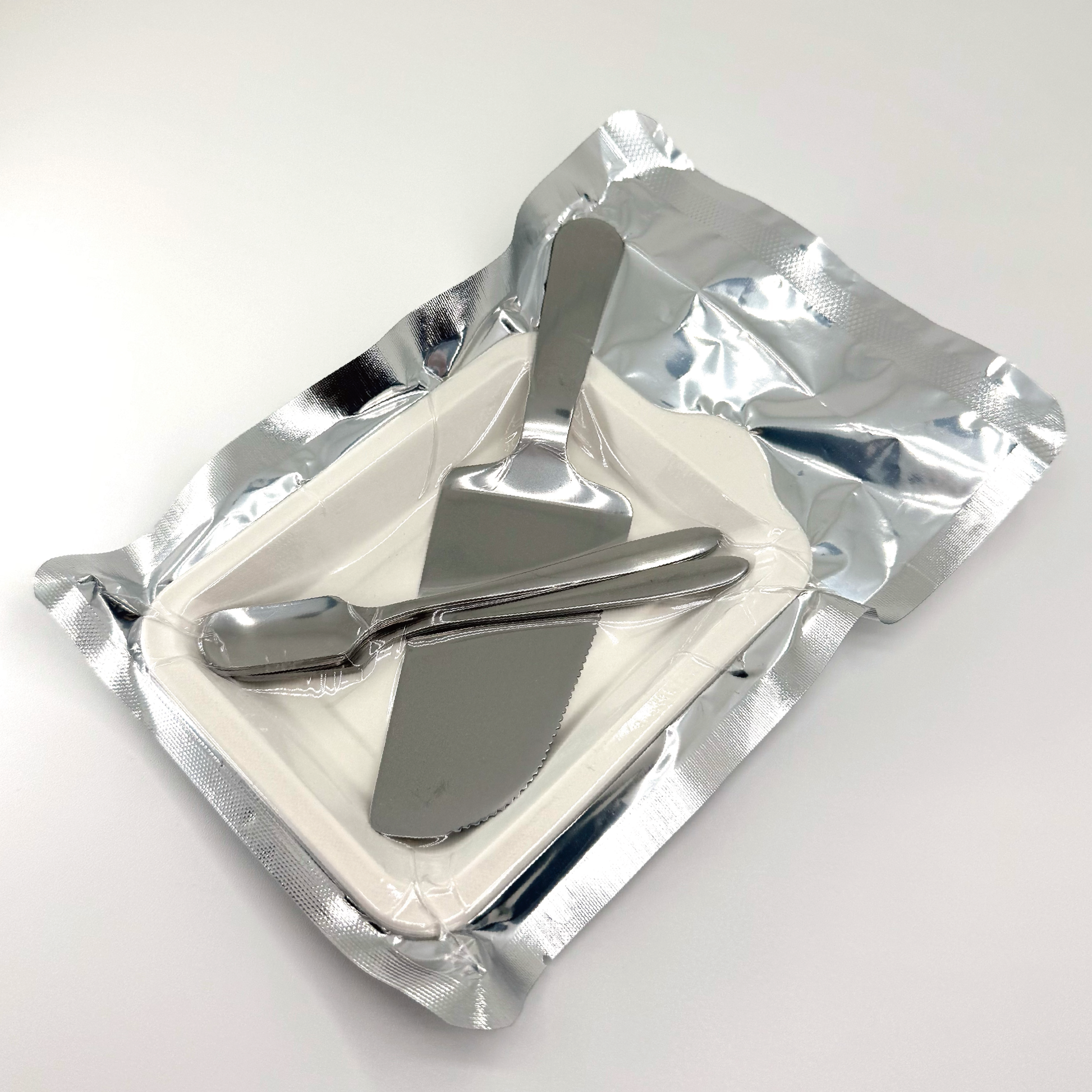 This silver cutlery set includes dessert spoon and a cake cutter, in packs of 5 or 10.